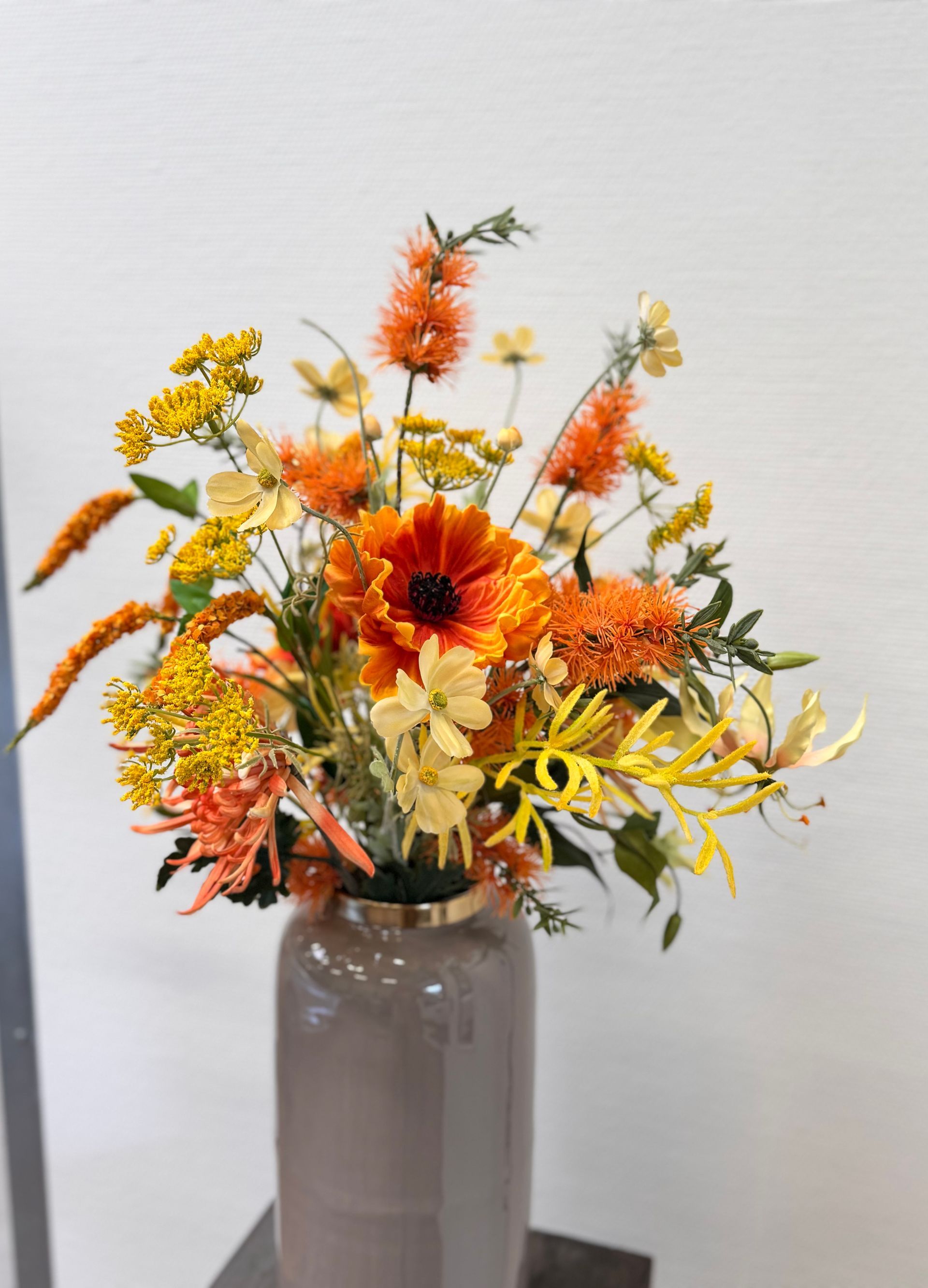 Dit frisse boeket brengt je ruimte meteen tot leven de kleur oranje staat voor energie-vrolijkheid en warmte denk aan de mooie zonsondergang.