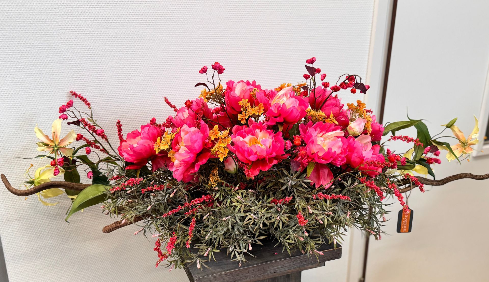 Dit uitgesproken boeket springt er helemaal uit als deze op een mooie grote diner tafel staat met haar mooie mix van liefdevolle en uitgesproken kleuren. Grote Pioenrozen en Gloriosa bloemen boeket mooi afgewerkt met groen en als basis een bruine sier tak gebruikt .